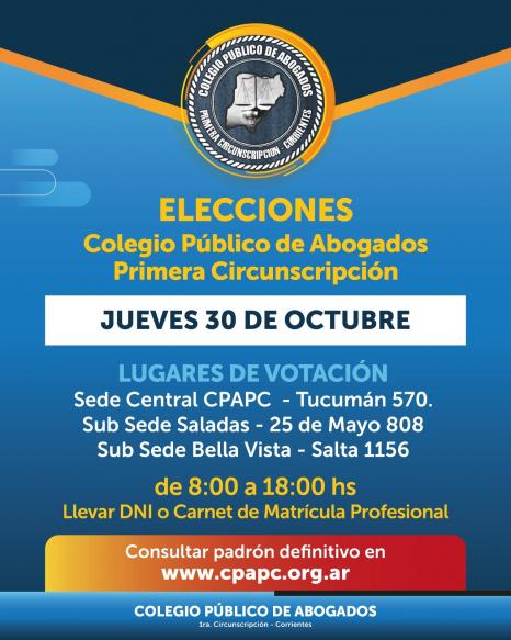 El Colegio Público de Abogados de la Primera Circunscripción Judicial de la provincia de Corrientes pone en conocimiento de sus matriculados el cronograma electoral 2025.